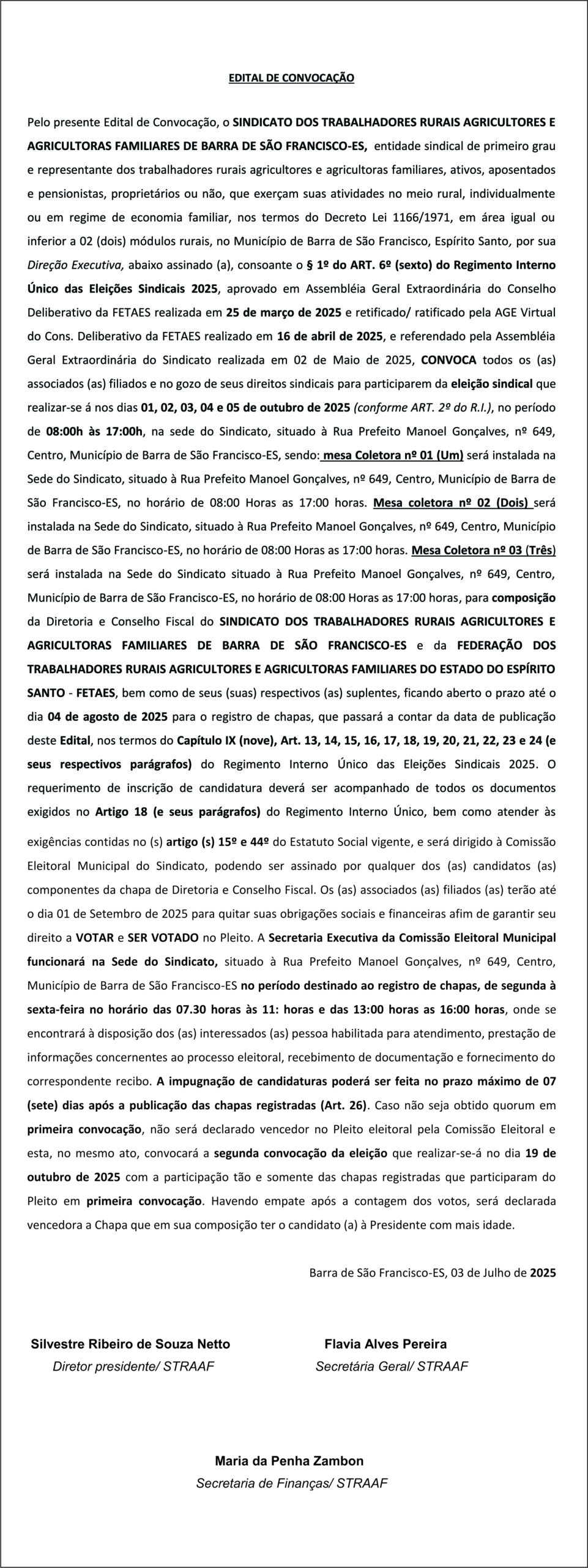 EDITAL DE CONVOCAÇÃO – Sindicato dos Trabalhadores Rurais Agricultores e Agricultoras Familiares de Barra de São Francisco